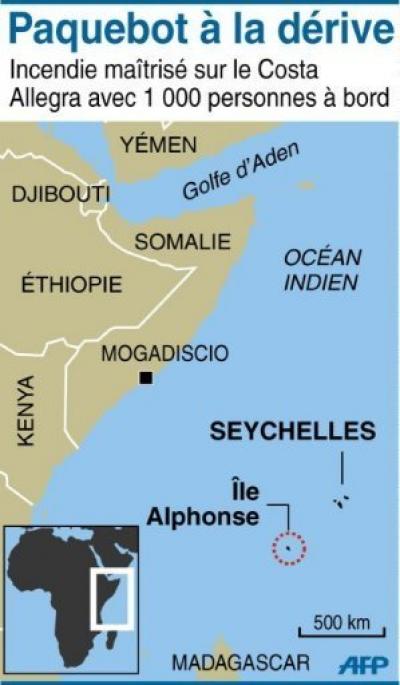 Un grand chalutier français est arrivé dans la nuit de lundi à mardi dans la zone au large des Seychelles où dérive le paquebot Costa Allegra, avec plus de 1.000 personnes à bord, et les deux capitaines sont en contact radio, a annoncé la compagnie Costa Crociere. »Le bateau de pêche de haute mer a rejoint le Costa Allegra et les deux capitaines sont en contact radio. Nous évaluerons à l’aube quelles sont les opérations d’aide que le bateau de pêche peut assurer », indique un communiqué du propriétaire du paquebot de croisière. Rappelons qu’une quinzaine de mauriciens, dont l’ex chef-juge Jocelyn Forget et son epouse,avaient pris place a bord le lundi 20 fevrier dernier.Le 13 janvier, un autre navire de cette compagnie maritime, le Costa Concordia, avait fait naufrage près de l’île italienne du Giglio provoquant la mort de 32 personnes.