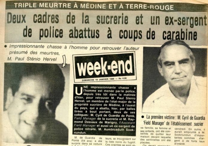 Une impressionnante chasse à l’homme est menée par la police depuis très tôt dans la matinée d’hier, pour retrouver Paul Sténio Hervel, un membre de l’état-major de la propriété sucrière de Médine, à l’ouest du pays, qui a abattu, hier, par balles tirées à bout portant, deux de ses collègues : Cyril de Guardia de Ponté, Field Manager, et Raymond Desvaux de Marigny, l’Assistant Field Manager, et aussi un sergent de police retraité, Aumbicaduth Sooknundun.