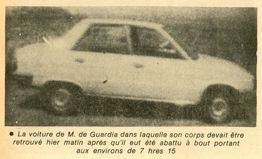 Un gardien qui habite à pas plus de 300 mètres du lieu du crime entend la détonation. Il avait auparavant aperçu les deux voitures et leurs occupants. Il fonce au bureau central pour avertir un supérieur, sentant au fond de lui-même qu’un drame atroce venait de se jouer à côté de sa maison. Il a entendu toutefois, avant de partir, un vrombissement d’un moteur, Piou-Piou venait de démarrer en trombe…
