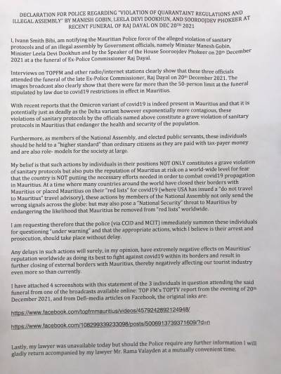 Ainsi, l’activiste a consigné une plainte à la police concernant la présence des ministres Maneesh Gobin et Leela Devi-Dookun, de même que le Speaker de l’Assemblée nationale Sooroojdev Phokeer qui, selon lui, « should be held to ‘higher standards’ than ordinary citizens ».