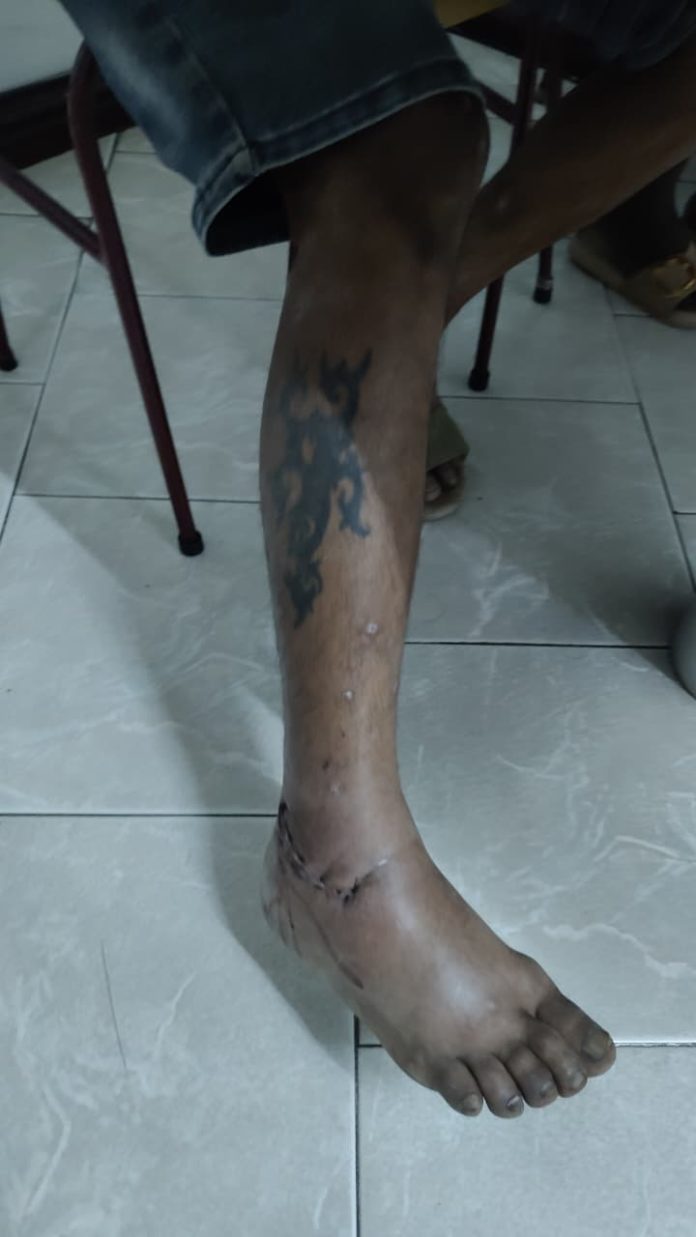 Il affirme avoir été agressé à coups de casque par le fils de la marchande, qui l’aurait ensuite blessé à la cheville à l’aide d’un objet tranchant. Il a été conduit d’urgence à l’hôpital Jeetoo, où il a été admis pour observation en salle.