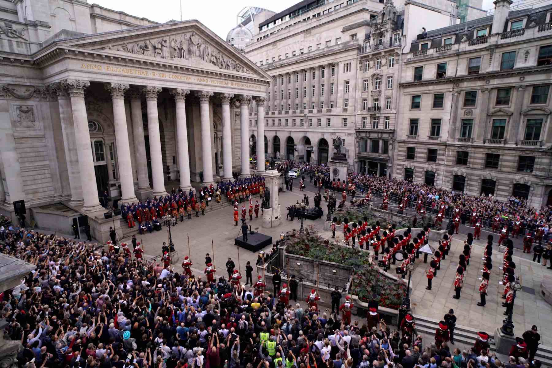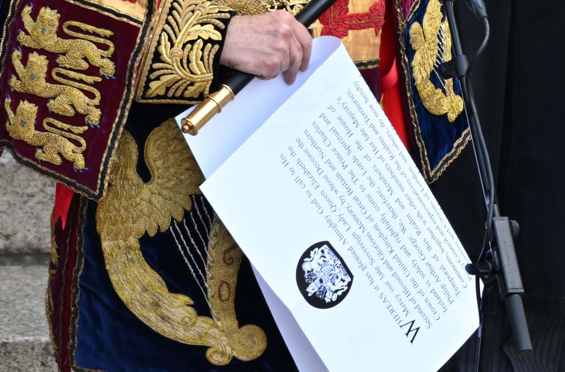 Clarenceux King of Arms Timothy Duke holds the secondary Proclamation after proclaiming the new King King Charles III, at the Royal Exchange in the City of London on September 10, 2022. – Britain’s Charles III was officially proclaimed King in a ceremony on Saturday, a day after he vowed in his first speech to mourning subjects that he would emulate his « darling mama », Queen Elizabeth II who died on September 8. (Photo by Leon Neal / POOL / AFP)