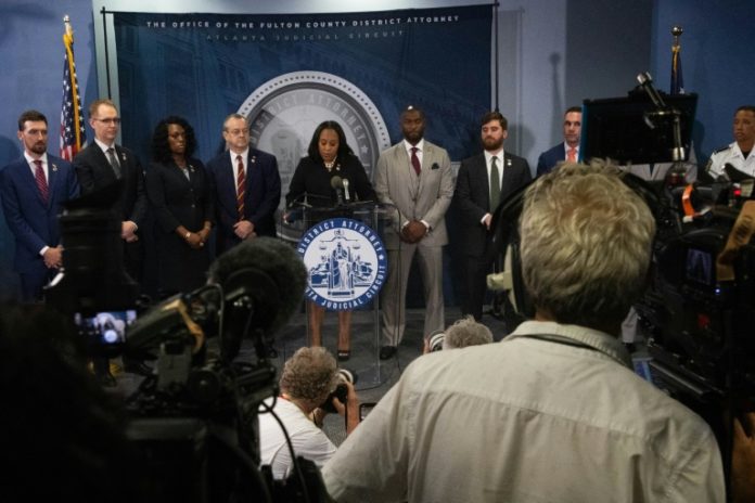 « L’acte d’accusation affirme qu’au lieu de se conformer au processus juridique de la Géorgie pour les contentieux électoraux, les prévenus se sont livrés à une entreprise criminelle en bande organisée pour inverser le résultat de l’élection en Géorgie », a souligné Mme Willis.