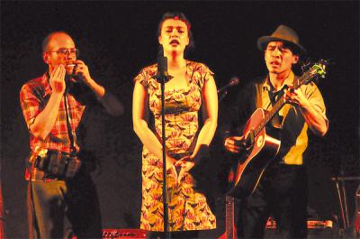 Le voyage commence en douceur avec la voix de Rosemary Standley, à la fois mystérieuse et magique. Toute en sensualité dans sa robe verte des années 50 aux motifs d’oiseaux, ses bottes noires, sa veste en cuir, ruban rouge autour de la tête et des lèvres rouge sang, elle s’installe derrière son micro telle une diva.