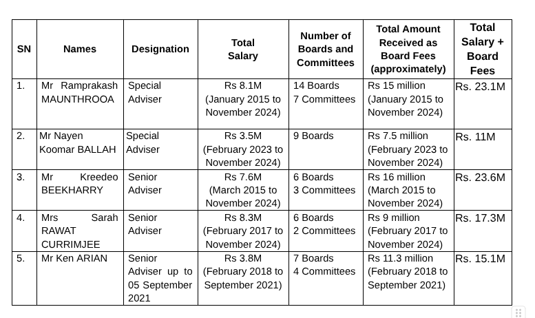 Ramprakash Maunthrooa, conseiller spécial, a perçu environ Rs 23,1 millions entre 2015 et 2024, dont Rs 15 millions en honoraires de conseil d’administration.