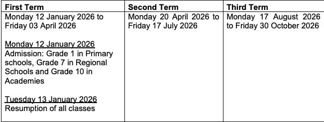 Le Conseil des ministres a pris note du calendrier scolaire pour l’année académique 2026, concernant les écoles primaires et secondaires. Le calendrier fixe les dates d’ouverture, de fermeture et de congés pour les différents trimestres.