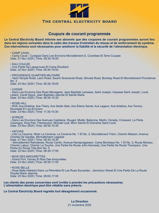 Finalement, le 25 Nov 2025 les alentours de Rose Belle , habitant dans les environs des routes   suivantes ,  route Janmohur  , une partie de la route et sur la route Royale Marie Jeannie , la coupure sera de  09h00 à 17h00