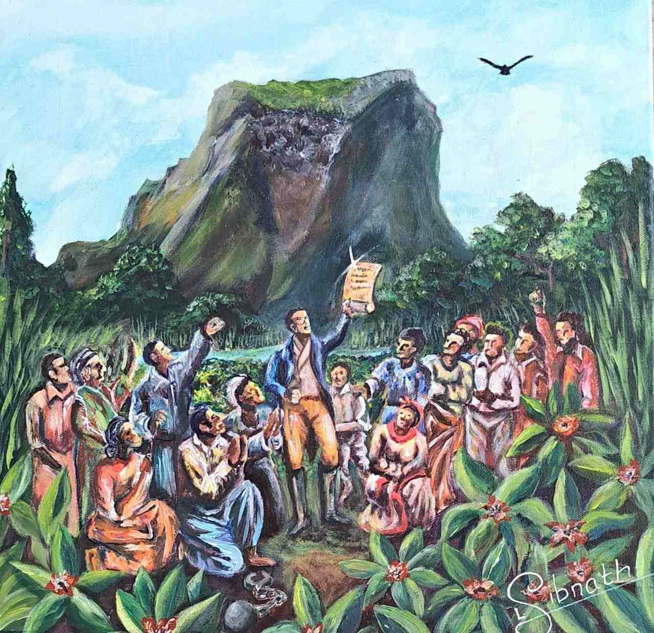 Lakaze Mama s’inspire de l’abolition de l’esclavage et met en lumière la double souffrance des femmes dans le passé. Les femmes réduites en esclavage sont représentées afin de montrer la douleur qu’elles ont endurée — non seulement en tant qu’êtres humains privés de liberté, mais aussi en tant que femmes chargées de s’occuper de leurs familles tout en vivant sous l’oppression. Au centre de l’œuvre se tient une figure de grand-mère, symbole d’espoir et de transition entre l’époque de l’esclavage et le monde moderne. Ornée de fleurs colorées représentant la joie, l’amour et l’espoir, elle incarne la résilience, la transformation et la libération des femmes à travers les générations. Ce sont là des interprétations globales d’une destination pour les personnes esclavagées. La traite des esclaves inflige des souffrances inimaginables à des millions de personnes. Elle engendre également des stéréotypes et des préjugés racistes qui perdurent dans la société, même aujourd’hui, près de 200 ans après l’abolition de l’esclavage.