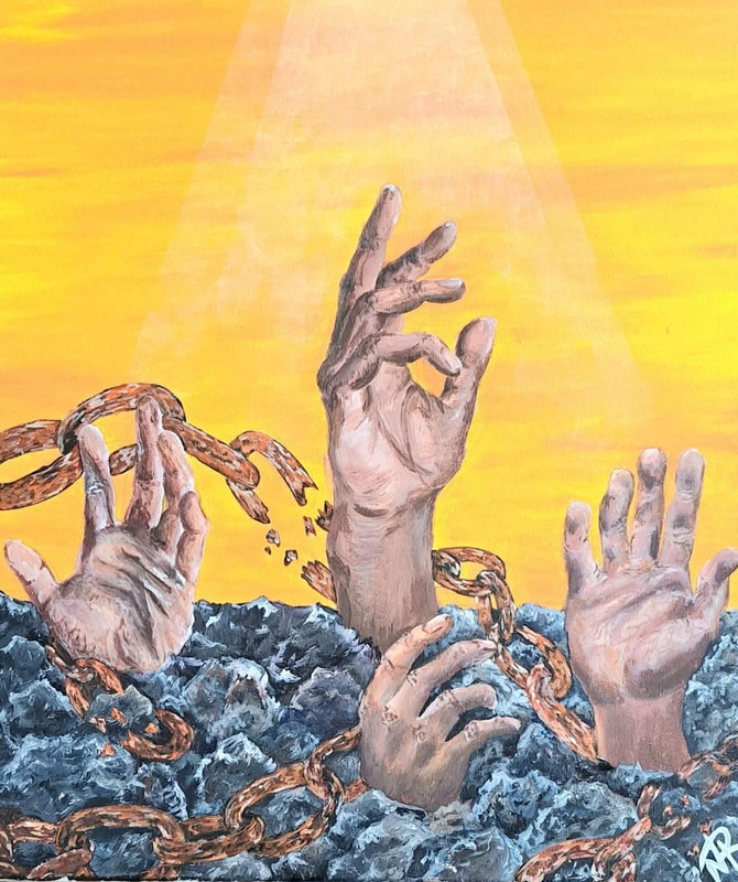 Silent Scream est une œuvre qui explore le thème de l’esclavage, de l’injustice et de la lutte pour la liberté. La femme au premier plan symbolise une personne réduite en esclavage exprimant les émotions qui bouillonnent en elle. Les mains et les chaînes qui se brisent représentent la fin de l’esclavage, tandis que la lumière venant d’en haut symbolise le chemin vers la liberté. La femme incarne la souffrance des personnes asservies. Les chaînes autour de son cou montrent comment elles étaient traitées de manière inhumaine et privées de liberté. Son expression de cri traduit la douleur et la torture qu’elle ressent, sans pouvoir être entendue — son cri est silencieux. Les chaînes brisées tendues vers la lumière symbolisent l’abolition de l’esclavage et l’espoir d’un avenir meilleur, où l’oppression et la souffrance ne domineront plus. Cette œuvre invite les spectateurs à réfléchir à la cruauté et à l’injustice de l’esclavage, ainsi qu’à la force dont nos ancêtres ont fait preuve pour endurer de telles épreuves. Elle nous rappelle que, même si leurs cris étaient silencieux, leur combat ne l’était pas. Dans l’ensemble, l’œuvre met en lumière la dure réalité de l’esclavage et le chemin vers un avenir plus libre et porteur d’espoir.