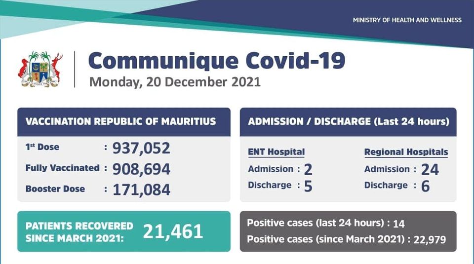 Un total de 14 cas positifs à la Covid-19 a été enregistré ce lundi 20 décembre, informe le ministère de la Santé.