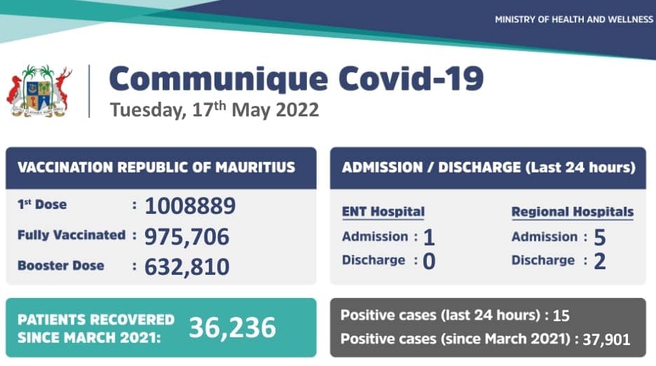 ACCUEILActualitésSociété Covid-19 : 15 cas positifs et 6 admissions annoncés ce mardi 17 Mai 2022 12h53 FacebookTwitterCopy URL Un total de 15 nouveaux cas positifs à la Covid-19 et 6 admissions ont été annoncé à Maurice par le ministère de la Santé, ce mardi 17 mai. - Publicité - Partager FacebookTwitterCopy URL EN CONTINU ↻ Affaire Reward Money : liberté conditionnelle accordée au sergent Hossen22 Août 2025 20h38 L’ambassadeur US met en exergue le partenariat durable avec Maurice22 Août 2025 20h00 À ROSE-HILL à 65 ans : double manif le 30 août et le 20 septembre22 Août 2025 19h00 Blanchiment d’argent : l’ASP Rajcoomar Seewoo maintenu en détention22 Août 2025 18h57 Un faux courriel usurpant la Police : la Cybercrime Unit ouvre une enquête22 Août 2025 18h56 Highlands : Un sex toy saisi chez un ingénieur22 Août 2025 17h00 Enquête judiciaire : l’affaire Juliette renvoyée au 18 septembre22 Août 2025 16h04 Barlow : 11 Indiens s’enfuient d’un dortoir22 Août 2025 16h00 Salaires bloqués des employés des SEN School : la CTSP réclame des actions immédiates22 Août 2025 15h46 Pension universelle et indépendance de la justice : le Reform Party monte au créneau22 Août 2025 15h45 TOUS LES TEXTES Lire le journal