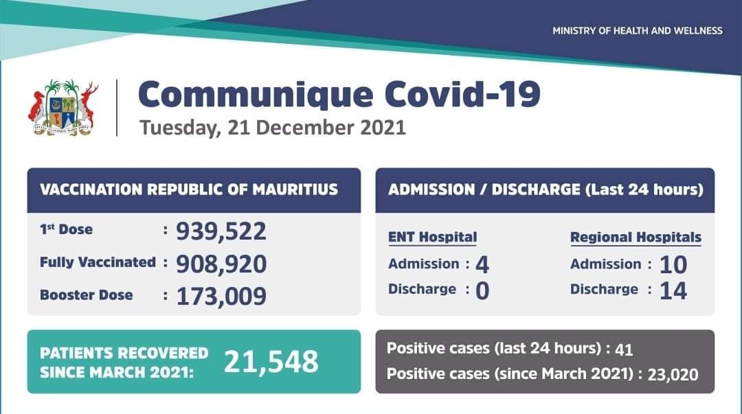 ACCUEILActualités Covid-19 : 41 nouveaux cas positifs annoncés ce mardi 21 Déc 2021 18h00 FacebookTwitterCopy URL Le ministère de la Santé annonce 41 nouveaux cas positifs à la Covid-19 ce mardi 21 décembre.- Publicité - Partager FacebookTwitterCopy URL EN CONTINU ↻ Développements politiques : Arianne Navarre-Marie se dit prête à assumer toute responsabilité23 Avr 2026 19h07 WPA GP Rabat 2026 : Les para athlètes en action aujourd’hui (18h30)23 Avr 2026 16h43 Météo- Veille de fortes pluies : Maurice et Rodrigues sous surveillance jusqu’à vendredi23 Avr 2026 16h28 Dans la région – Les Seychelles accélèrent leur coopération avec la Russie : Vladimir Putin reçoit le Président Patrick Herminie23 Avr 2026 16h25 Jeu-concour – Samudra Art Prize :Utiliser l’art pour sensibiliser le public23 Avr 2026 16h00 Assemblée nationale | Débats sur le Certificate of Character Bill – Chetan Baboolall de la nouvelle opposition « Une forme de sanction perpétuelle si le...23 Avr 2026 16h00 Bras de fer irano-américain dans le détroit d’Ormuz23 Avr 2026 15h24 Assemblée nationale | Débats sur le Certificate of Character Bill – Balkrishna Babajee, Backbencher: « Valoriser la réhabilitation et accorder une seconde chance »23 Avr 2026 15h00 PALMERSTONE : De l’argent et des bijoux volés chez un septuagénaire 23 Avr 2026 15h00 Assemblée nationale | Débats sur le Certificate of Character Bill – Rubna Daureeawo , Backbencher: « La seconde chance doit être réelle »23 Avr 2026 14h00 TOUS LES TEXTES Lire le journal