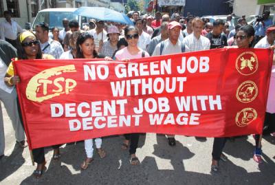 Auparavant, la présidente de la CTSP a expliqué le choix du thème de la journée, « No Green Jobs, without Decent Jobs and Decent Wage ». « Gouvernma finn angaz li dan proze Maurice Île Durable (MID), me eski kapav ena enn lil Moris durab kot ena green jobs san ki bann travayer ena enn travay desan ? Enn lil durab se pa zis enn pei kot respekte lanvironma, me sirtou kot respekte letre imin dan tou so dimension. Ce n’est pas possible qu’à son travail quelqu’un soit tenu de respecter l’environnement, mais une fois chez lui qu’il soit obligé, par exemple, de brûler le bois pour cuire à manger, parce que son salaire ne lui permet pas de s’acheter du gaz ou de payer l’électricité ».