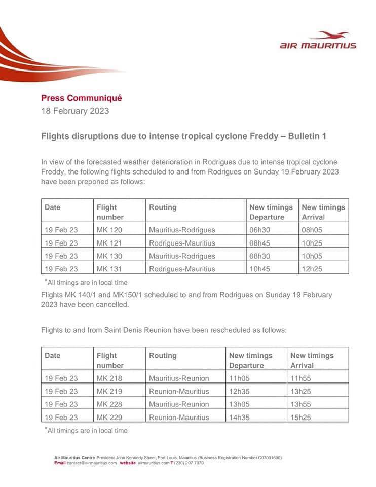 En raison du cyclone tropical intense Freddy, plusieurs vols d’Air Mauritius prévus sur Rodrigues ont été reprogrammés. Rappelons qu’hier samedi 18 février, Rodrigues est passée en alerte 2.
