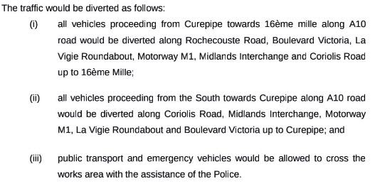 Dans le cadre de la phase 1 de la construction du »link road » La Vigie-La Brasserie-Beaux Songes, d’importants travaux routiers seront entrepris jusqu’au 20 décembre 2022, sur la route A10 Phoenix-Plaisance, à proximité du garage du UBS à 16ème Mille, par la société General Construction Ltd, pour le compte de la Road Development Authority.
