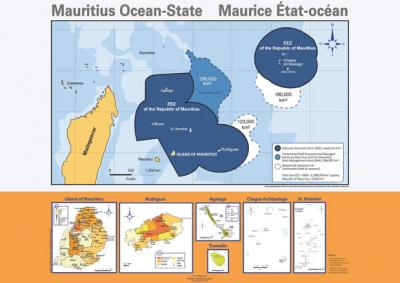 Cette carte devrait apparaître peu à peu dans toutes les écoles primaires notamment dans les classes standard IV, V et VI, à Maurice, Rodrigues et Agalega. Réalisée par Osman publishing en collaboration avec le Mauritius Institute of Education et l’Office of Ocean affairs and development (PMO), cette carte été réalisée sous la supervision du Dr Shafick Osman, en charge de la faculté de géopolitique de l’université des Mascareignes qui est intervenu sur ce projet en tant que consultant. Financée par Sun insurance, elle permet de prendre la mesure de l’immense domaine marin mauricien, et d’en distinguer les différentes zones selon leur statut : la zone économique exclusive qui représente avec le domaine marin des Chagos environ 2 millions de km2, les bancs de Salha de Maya gérés conjointement avec les Seychelles (Joint management area) qui s’étend sur 396 000 km2, et enfin deux zones en pointillé de 123 000 et 180 000 km2 qui correspondent à une demande d’extension du domaine des bancs de pêche. Le ministre des affaires étrangères Arvin Boolell était présent à la cérémonie de remise de ces cartes à son homologue du ministère de l’Education. L’éditeur précise qu’Arvin Boolell avait réalisé le tout premier exposé public sur ce concept d’état-océan en 2011.