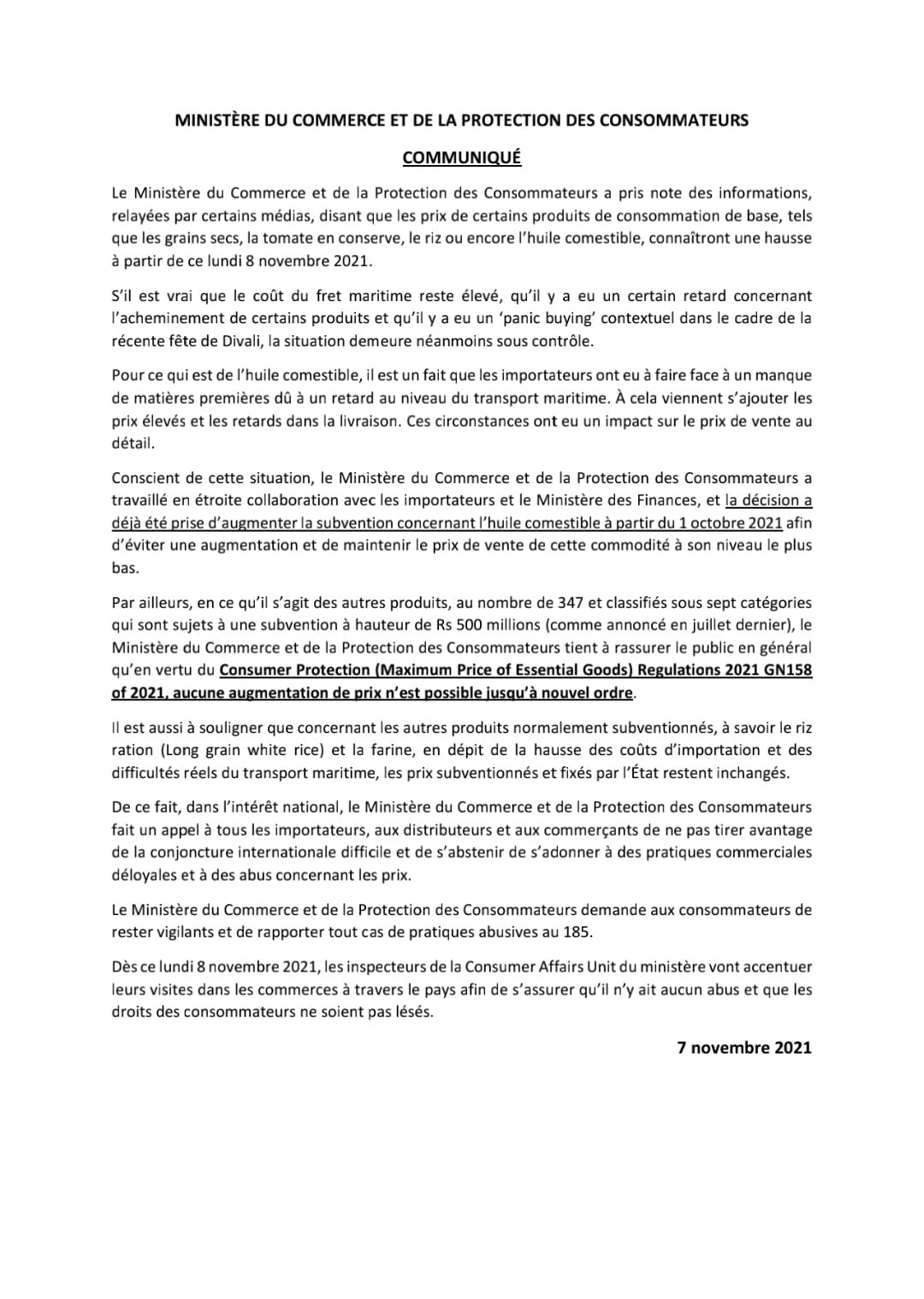 Dans un communiqué émis ce dimanche 7 novembre, le ministère du Commerce soutient que « s’il est vrai que le coût du fret maritime reste élevé, qu’il y a eu un certain retard concernant l’acheminement de certains produits et qu’il y a eu un ‘panic buying’ contextuel dans le cadre de la récente fête de Divali, la situation demeure néanmoins sous contrôle », peut-on lire.