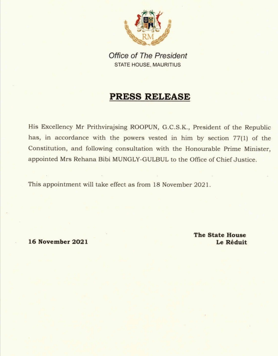 Le président de la République, Pradeep Roopun, conformément aux pouvoirs qui lui sont conférés par l’article 77(1) de la Constitution et après consultation avec le Premier ministre, a nommé Bibi Rehana Mungly-Gulbul au poste de Chef Juge.