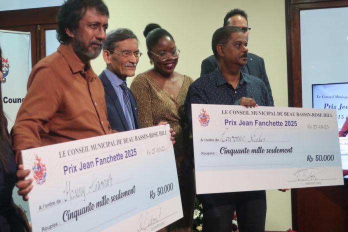 Nicolas Couronne et Amarnath Hosany ont reçu le lundi 27 octobre le Prix Jean-Fanchette 2025, doté de 50 000 roupies (chacun). Le Prix Jean-Fanchette a 33 ans ! C’est la 15e fois depuis 1992 que le coordinateur du prix, Issa Asgarally a pris la parole pour rappeler les objectifs du Prix Jean-Fanchette dont la principale est d’honorer la mémoire du psychanalyste, poète, essayiste, éditeur. J.M.G. Le Clézio, Président du jury a salué deux manuscrits parmi les 32 textes envoyés entre le 27 août et le 22 septembre : Le Clown d’Amarnath Hosany et Le regard de l’ancêtre esclave de Nicolas Couronne. Le Clown d’Amarnath Hosany « un roman qui dénonce la discrimination ethnique vécue par un enfant à Maurice », selon Le Clézio et le manuscrit de Nicolas Couronne est résumé comme « un beau texte inspiré par l’histoire exemplaire de deux jeunes mauriciennes esclaves déportées en 1835 au bagne de l’Australie… » La cérémonie s’est déroulée à la Mairie de Beau-Bassin/ Rose Hill en présence de la mairesse Gabriella Batour et un parterre d’invités.