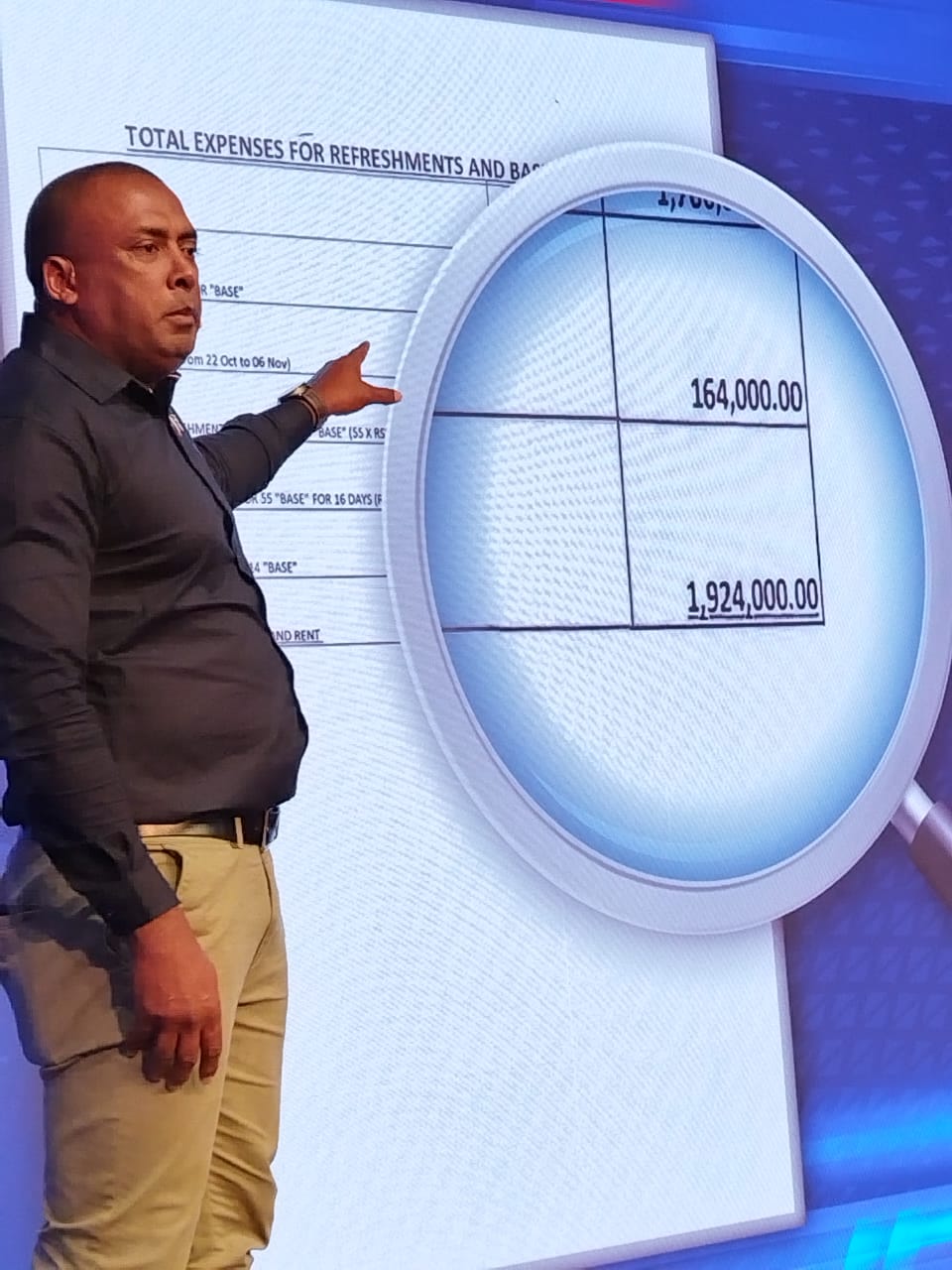 Des captures d’écrans de site de presse et des images des « Kistnen Papers » ont été diffusées à l’écran. Il a montré quelques chiffres qui s’y trouvaient en insistant sur le fait que beaucoup plus d’argent que ce qui est déclaré par le Premier ministre a été dépensé par ce dernier pour la campagne électorale.