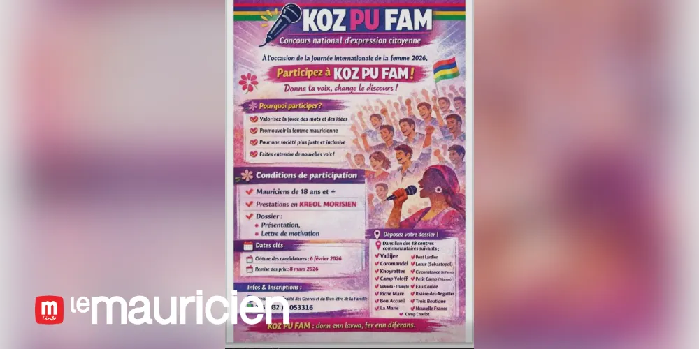 Plus qu’un concours, Koz Pu Fam est un véritable espace de réflexion, de créativité et d’échange, qui met en avant la puissance des mots et des idées, tout en valorisant l’usage du kreol morisien comme langue de transmission, d’inclusion et de participation citoyenne. À travers cette initiative, le ministère entend encourager l’émergence de nouvelles voix engagées et stimuler le débat public sur les enjeux liés à l’égalité des genres.
