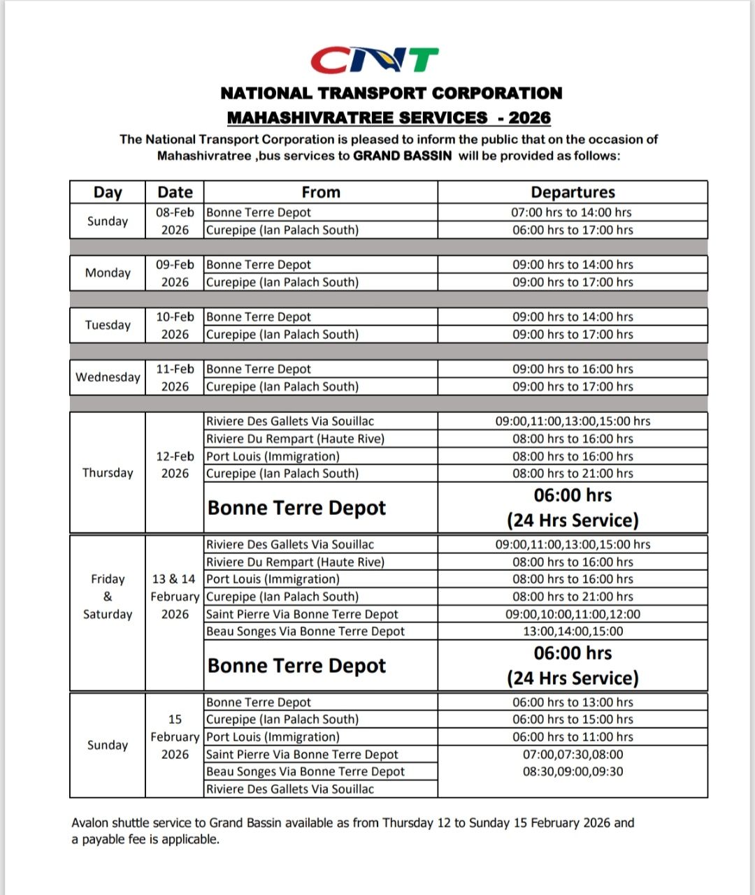 Pour la première phase du pèlerinage, entre le dimanche 8 et le mercredi 11 février, le service sera principalement assuré au départ du dépôt de Bonne Terre et de la gare Ian Palach South à Curepipe. Les rotations débuteront généralement vers 7 h ou 9 h pour se terminer en fin d’après-midi, aux alentours de 17 h.
