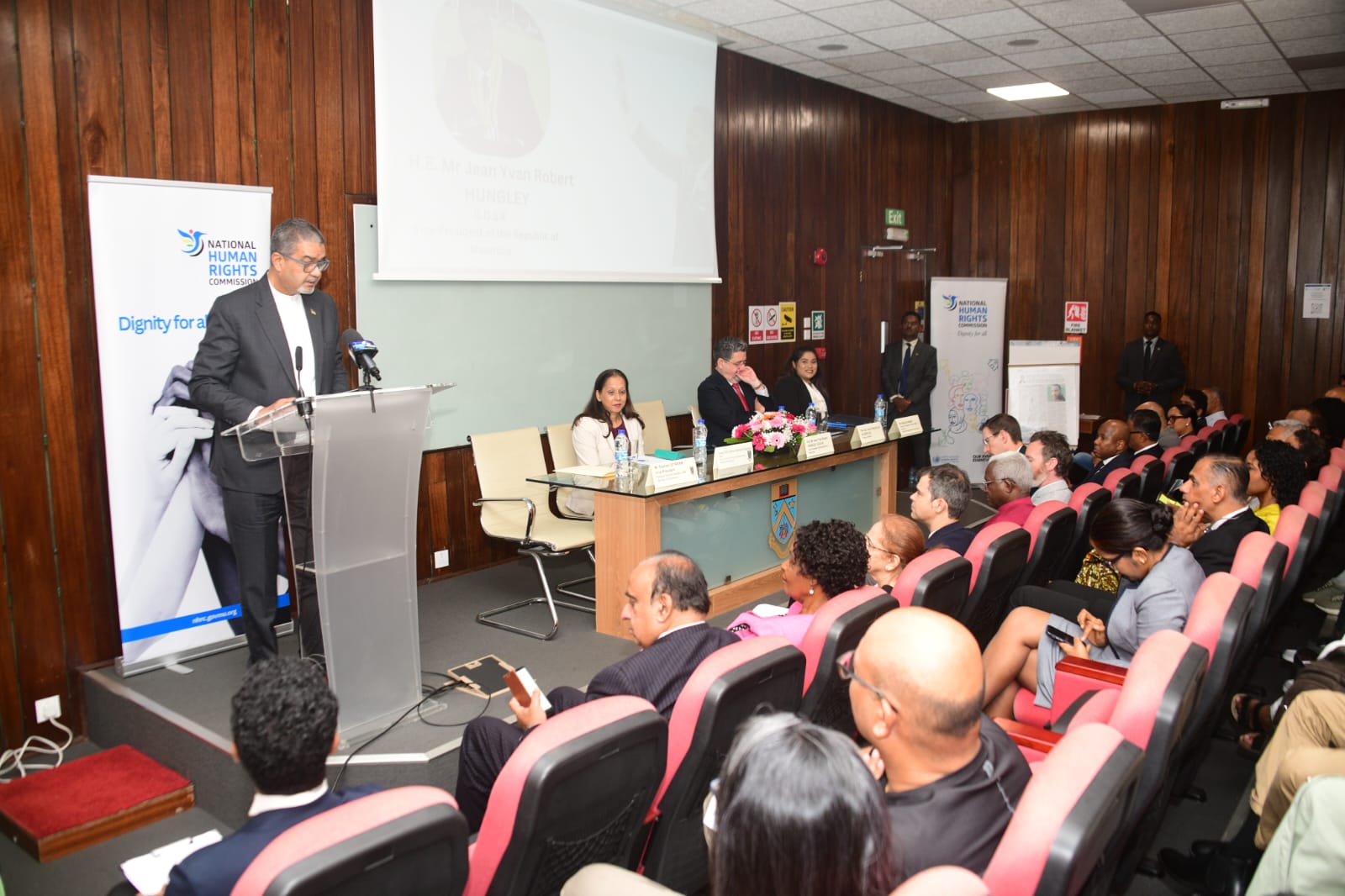 Plusieurs personnalités du corps diplomatique et d’institutions nationales et internationales étaient également présentes, nommément la haute commissaire d’Afrique du Sud, l’ambassadrice d’Égypte, le Junior Minister aux Affaires étrangères, le chargé d’affaires américain, le chargé d’affaires de Madagascar, la directrice de l’Equal Opportunities Commission et le directeur du Centre Nelson Mandela pour la culture africaine, entre autres. Étaient aussi présents plusieurs dizaines d’étudiants et enseignants de l’UoM.