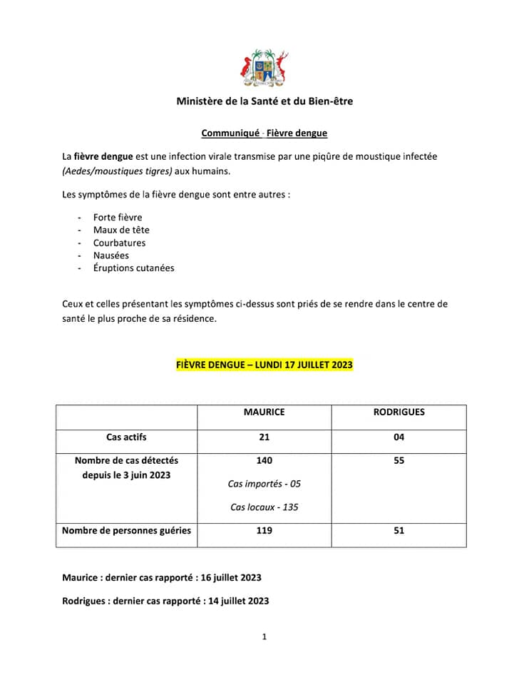 Maurice compte actuellement un total de 21 cas actifs de dengue. Chiffre fourni par le ministère de la Santé, ce lundi 17 juillet.