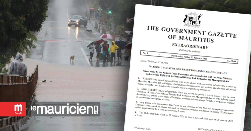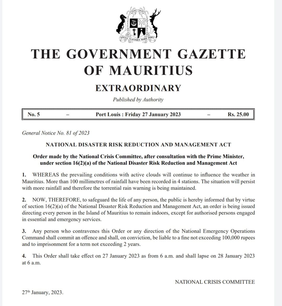 Le Comité national de crise après avis du Premier ministre et conformément à l’article 16 (2) (a) de la loi nationale sur la gestion de la réduction des risques de catastrophe, a décidé qu’AUCUNE personne, à l’exception de celles autorisées et engagées dans les services essentiels et d’urgence, ne sera permise à l’extérieur jusqu’à 6 heures du matin, ce samedi 28 janvier.