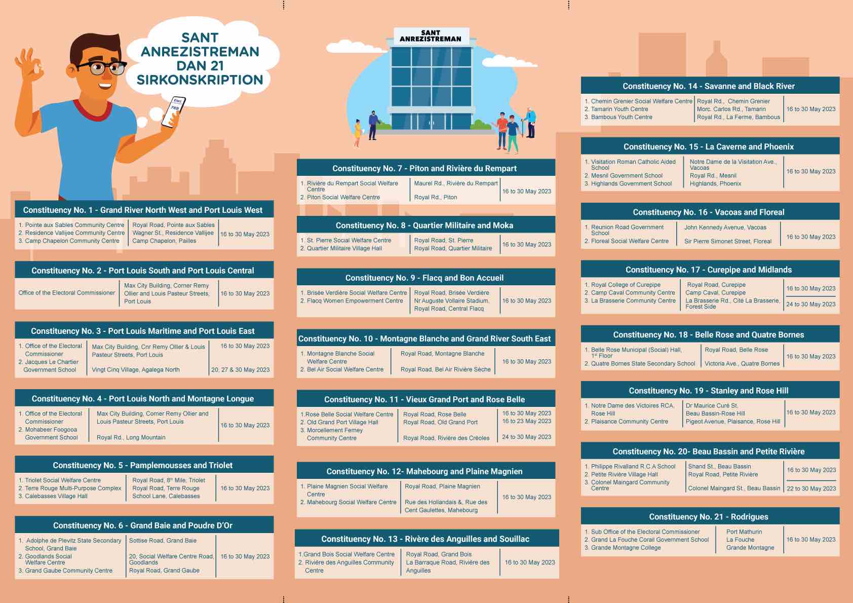 L’exercice d’enregistrement qui a débuté le 16 mai à travers différentes circonscriptions du pays a lieu à travers l’île, dans tous les centres d’inscription et au bureau du Commissaire électoral, à Port-Louis, de 16 à 17h30 du lundi au vendredi ; à Rodrigues, de 15h30 à 17h, du lundi au vendredi.