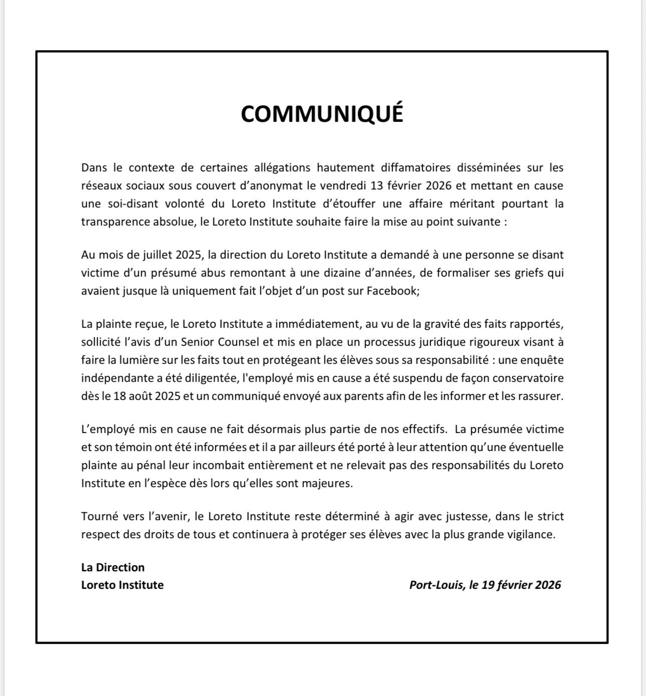 L’atmosphère était électrique ce matin lors de la réunion d’information organisée au Loreto Junior de Curepipe. Confrontée à des parents révoltés par la gestion d’allégations d’abus visant un ancien professeur de musique, la direction a dû s’expliquer sur plusieurs mois de silence et sur ce qu’elle a reconnu désormais face aux parents comme « un signalement tardif aux autorités ».