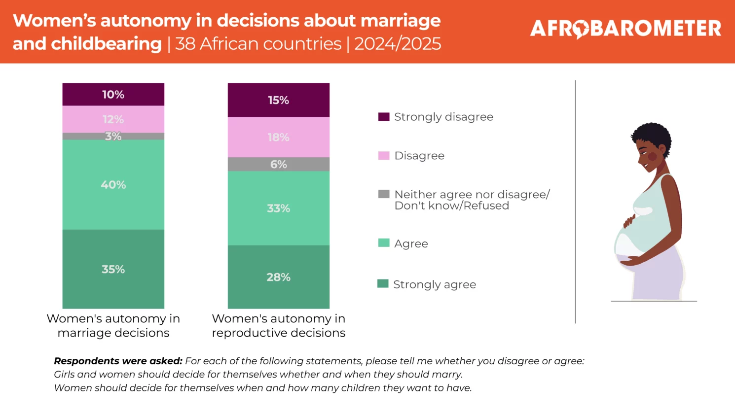 L’enquête met également en évidence un soutien massif aux droits des femmes : 86% des répondants affirment que les femmes doivent décider librement du moment du mariage ; 77% soutiennent leur droit de choisir le nombre d’enfants et le moment des naissances. Les femmes elles-mêmes expriment un soutien encore plus marqué à ces principes, révélant une dynamique sociale en faveur de l’égalité et de l’autonomie. Ces résultats s’inscrivent dans le cadre des objectifs de Nations unies, notamment l’Objectif de développement durable no. 5 consacré à l’égalité des genres.