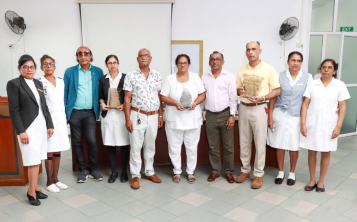 Six membres du personnel soignant de l’hôpital Victoria, qui partiront bientôt à la retraite, ont été honorés jeudi pour leurs bons et loyaux services. Il s’agit de Veejay Kumar Modi, Director of Nursing au ministère de la Santé, Amawtee Seegobin, Acting Nursing Administor, Veenah Krishna Dabeesingh, Acting Nursing Supervisor, et les Ward Managers Indira Beekoo, Aboo Swaley Jugon et Choomeswar Nurjandooa.
