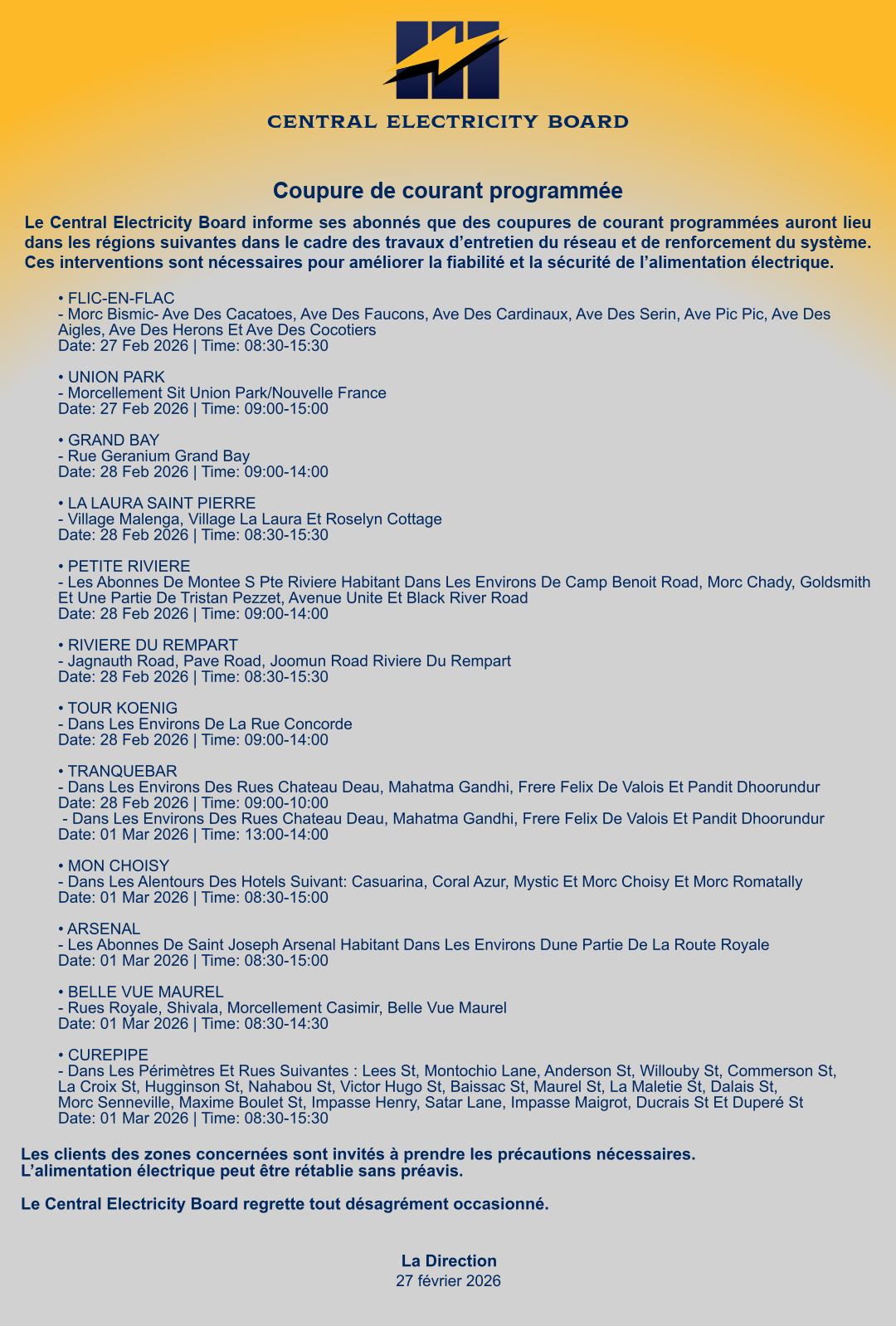 Des coupures d’électricité sont programmées dans plusieurs régions du pays les 27 et 28 février ainsi que le 1er mars. Le Central Electricity Board indique que ces interruptions s’inscrivent dans le cadre de travaux d’entretien et de renforcement du réseau.