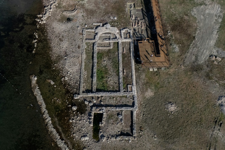 Sous l'effet du changement climatique, la baisse du niveau du lac révèle la basilique du IVe siècle, effondrée au XIe après une série de violents tremblements de terre et peu à peu noyée, deux siècles plus tard, par la montée des eaux.