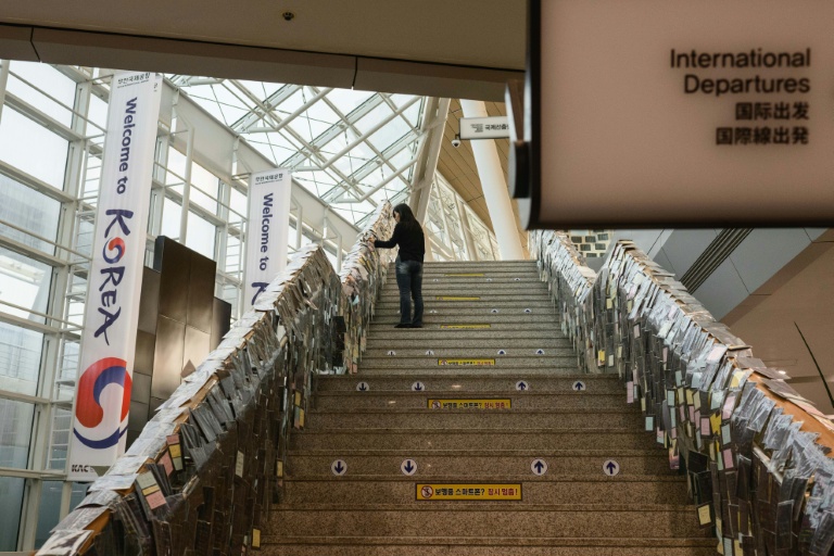 L'aéroport de Muan, fermé aux vols commerciaux depuis l'accident, accueille nombre de familles de victimes qui passent des jours et des nuits sous des tentes dressées dans le hall des départs au second étage du terminal.