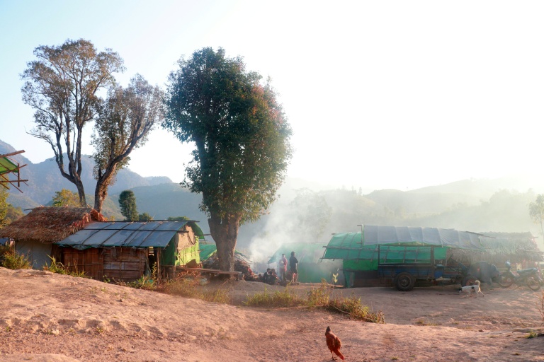 Du haut d'un relief dans une vallée montagneuse, des combattants rebelles de l'Armée nationale Kayan surveillent un camp où vivent des centaines de déplacés, dans des structures de bambou ayant pour toit et murs des toiles de plastique.