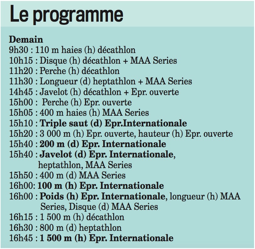 Si les expatriés De Grace (Suisse) et Orwin Émilien (États-Unis) se sont déjà signalés samedi, ce dernier à la fois aux 800 m et 200 m, tel n’est pas le cas pour la spécialiste du 400 m Aurélie Alcindor, rentrée des États-Unis. Elle n’est pas annoncée au 200 m (international) ni au 400 m (MAA Series) pour cause de blessure, avonsnous appris. Ailleurs, le 200 m dames est à surveiller avec la présence de la Sud-Africaine Tamzin Thomas (23”12) et la Malgache Sylvia Florence Andrianandrianina (24”00), alors qu’au lancer du javelot, la Sud-Africaine Jo-Ane Van Dyk, déjà vainqueur l’an dernier (55,43 m), se présente avec une performance de 54,82 m face à Jessika Rosun (50,88m) et