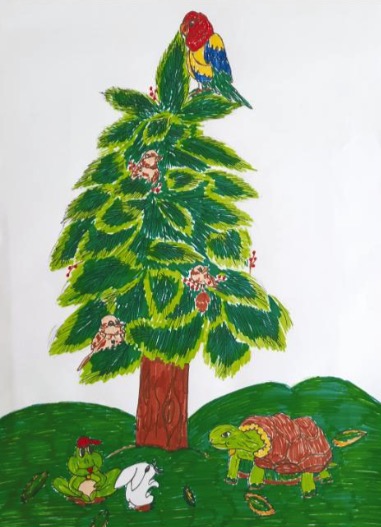 On est le 24 décembre, tout le monde est réuni autour du sapin. L’Ara trône au sommet, quelques moineaux sont perchés un peu plus bas. Un majestueux paille-en-queue plane autour. Les autres animaux sont installés au pied de l’arbre de Noël. Turbo en chef d’orchestre fait un signe de la patte. La communauté reprend en chœur.