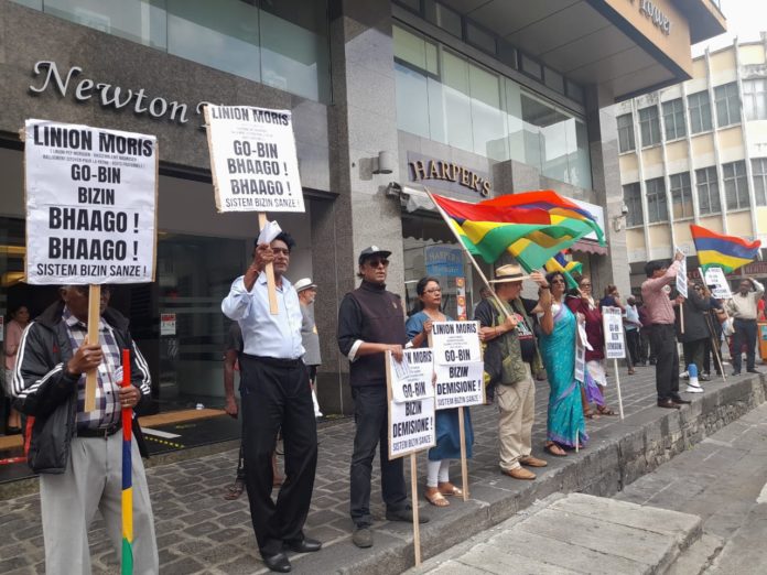 Linion Moris a tenu une manifestation symbolique hier devant les locaux du ministère des Affaires étrangères pour réclamer la démission du ministre de tutelle et Attorney General, Maneesh Gobin, pour son implication dans l’octroi du bail du terrain de chasse de Grand-Bassin à l’association The Eco Deer Park. Les dirigeants politiques de Linion Pep Morisien, du Rassemblement Mauricien aussi bien que ceux des Verts Fraternels étaient munis de pancartes. Le libellé des slogans était des plus explicites Go-Bin Bizin Demisione, Go-Bin Bizin Bhaago.