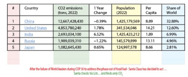 No, this year Santa Claus decided to deliver truth bombs, wrapped in sarcasm and tied with a ribbon of sheer exasperation to the four leaders with countries topping the list for carbon emissions.