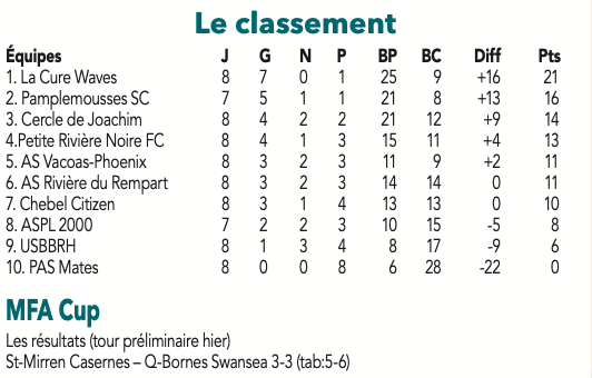 Même scénario du côté des Casernes, où Sainte Mirren et Quatre-Bornes Swansea ont offert un spectacle ouvert et offensif (3-3). Là encore, la décision s’est faite depuis le point de penalty, et Swansea a su garder son sang-froid pour l’emporter 6-5.