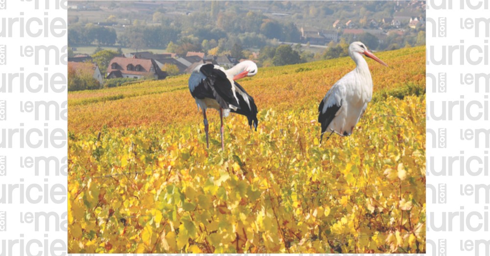 Au pied des Vosges, dans des écrins de verdure, une succession de villages fortifiés aux maisons d’opérette nous attendent. Charmantes étapes où Les cigognes, annonciatrices du printemps,  font leur nid, brin après brin, inlassablement sur le même toit, année après année. Un nid peut peser jusqu’à 500 kg ! La vigne ondule tout au long du versant Est des Vosges. Au rythme des saisons, les villages se colorent et nous enchantent. De générations en génération, on vendange à partir du mois de septembre. Déjà l’automne, les vignes jaunissent. Elles dansent la fête des vendanges, alors que les cigognes, messagères du Printemps, se préparent à partir, elles aussi au rythme de la nature. Et, comme par mimétisme, l’Alsace, enracinée dans son folklore, chante ses cigognes, en rouge, noir et blanc.