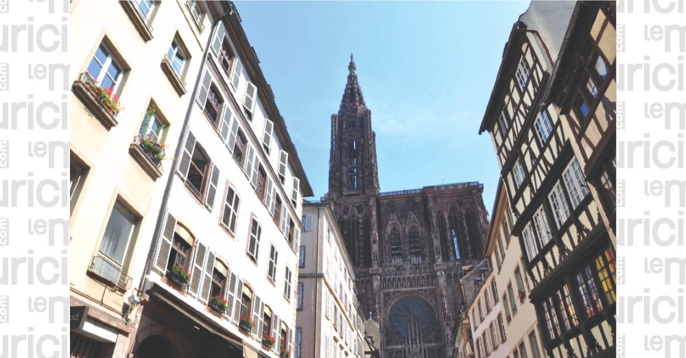 Plus loin, la place Gutenberg dont le statut évoque l’inventeur de l’imprimerie à caractères mobiles au 15ème siècle. C’est ici un haut lieu de représentation folklorique et musicale  toute l’année. À l’angle, en empruntant la rue Mercière, on se retrouve, entre deux rangées de maisons à colombages, face à un rideau de dentelle de pierre. Nous voici au pied de la cathédrale Notre-Dame de Strasbourg, au cœur de la vieille ville ! On peut admirer ce vaisseau de pierre en grès rose des Vosges. À « Hauteur d’ange », on lève les yeux vers le ciel, à 142 m de hauteur. Elle fut le monument le plus haut de la chrétienté dès le 15ème siècle. Sa façade occidentale est à la gloire de Marie avec au centre, la Vierge et l’Enfant, au dessus la passion du Christ et sur les cotés la mise en scène de saints et apôtres en posture méditative.