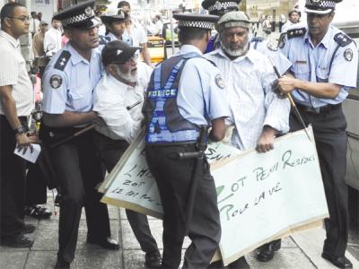 Il est 12 h 15 lorsqu’ils traversent la route Royale avant d’amorcer une dispersion. Mais le Dr Damree, secrétaire général du FSM, et Goorooduth Awotar continuent à scander leur « révolte » jusqu’aux alentours de la Mauritius Chamber of Industry and Commerce, attirant l’attention de certains passants. Deux policiers tentent alors de maîtriser le Dr Damree. Les échanges montent en intensité, alors que d’autres manifestants reviennent sur les lieux et que survient une vive altercation avec les membres de la force policière. L’arrestation de Mobin Mauthoor aura particulièrement bousculé la vingtaine de passants curieux. Il aura fallu quatre policiers afin de le maîtriser.