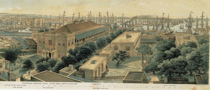 Tableau de F. Fiebig. Au centre l’hôpital du Roy (1735), à gauche l’aile Nord bis devenue Hôpital Civil en 1850. Source : Satyendra Peerthum, Historien de l’Aapravasi Ghat Trust Fund.