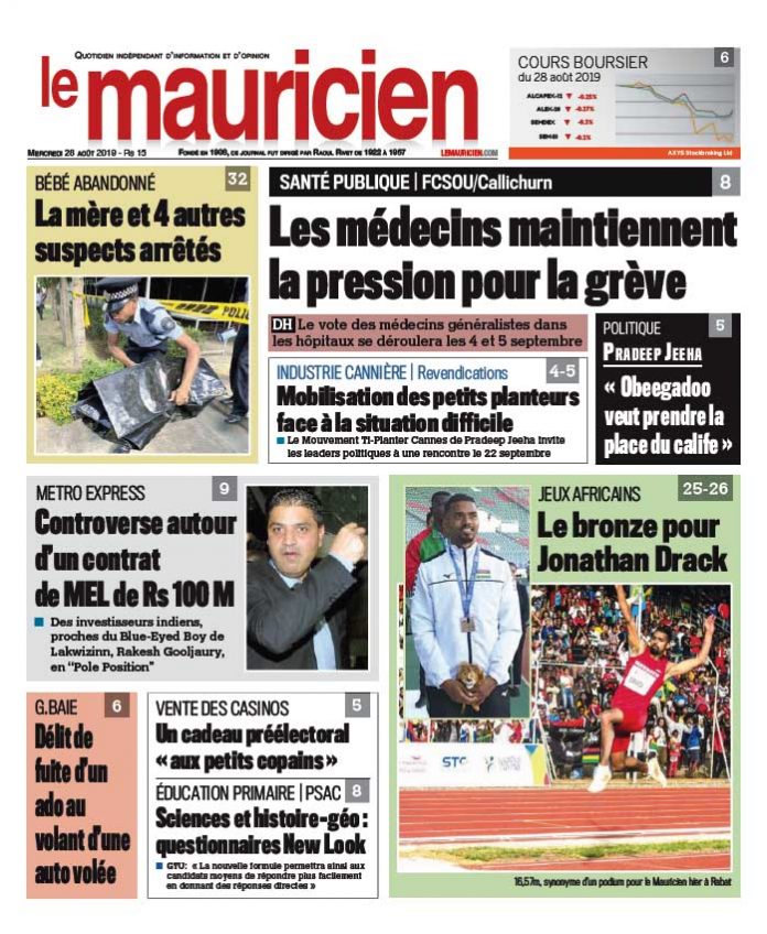 28 Août 2019 15h00 Le Mauricien du 28 août 2019 Abonnement Le journal en continue Mbappé remporte son bras de fer contre le PSG, condamné à lui verser 61 millions d’euros 16 Déc 2025 20h32 Plus de 21 ans de prison pour l’automobiliste qui avait foncé dans la foule à Liverpool 16 Déc 2025 20h10 Technologie : St Andrew’s School remporte l’AI Innovation Challenge 16 Déc 2025 20h00 Générateur en panne: Agaléga privée d’électricité 16 Déc 2025 19h45 Vision 2050 : Coup d’envoi des consultations pour repenser Maurice de demain 16 Déc 2025 19h00 Décision du Directeur des poursuites publiques : 2 des 5 charges contre Raquel Jolicœur rayées 16 Déc 2025 18h00 Chagos Deal: coup de pouce de Londres aux Communes 16 Déc 2025 17h00 #Savetheblu : l’avenir de l’océan au cœur d’une réflexion collective 16 Déc 2025 16h00 Loading... ACTUALITÉS Mbappé remporte son bras de fer contre le PSG, condamné à lui verser 61 millions d’euros Le Paris SG a été condamné à verser près de 61 millions d'euros à son ancienne star Kylian Mbappé, mardi par les prud'hommes de... 16 Déc 2025 20h32 Plus de 21 ans de prison pour l’automobiliste qui avait foncé dans la foule à Liverpool 16 Déc 2025 20h10 Générateur en panne: Agaléga privée d’électricité 16 Déc 2025 19h45 #Savetheblu : l’avenir de l’océan au cœur d’une réflexion collective 16 Déc 2025 16h00 Mbappé remporte son bras de fer contre le PSG, condamné à lui verser 61 millions d’euros Le Paris SG a été condamné à verser près de 61 millions d'euros à son ancienne star Kylian Mbappé, mardi par les prud'hommes de... 16 Déc 2025 20h32 si vous l'avez raté Mare-La-Chaux : le corps d’un jeune homme disparu retrouvé en état de décomposition 16 Déc 2025 13h53 Depuis janvier : 118 mineurs placés en shelters par la justice 16 Déc 2025 13h29 vidéos Réformes scolaires: l’ancienne ministre de l’éducation dénonce un système jugé élitiste et excluant 15 Déc 2025 16h07 Disque de l’année : les artistes dénoncent une participation… sans aucun paiement 11 Déc 2025 07h00 [LIVE] Assemblée Nationale : la PNQ du jour axée sur les dépenses électorales de décembre 2024 9 Déc 2025 09h09 Reconfiguration de l’avenue Père Laval : un projet de Rs 10 millions officiellement ouvert aux automobilistes 3 Déc 2025 15h26 Rapport du PRB : Navin Ramgoolam ne peut avancer de date pour la publication 2 Déc 2025 12h33