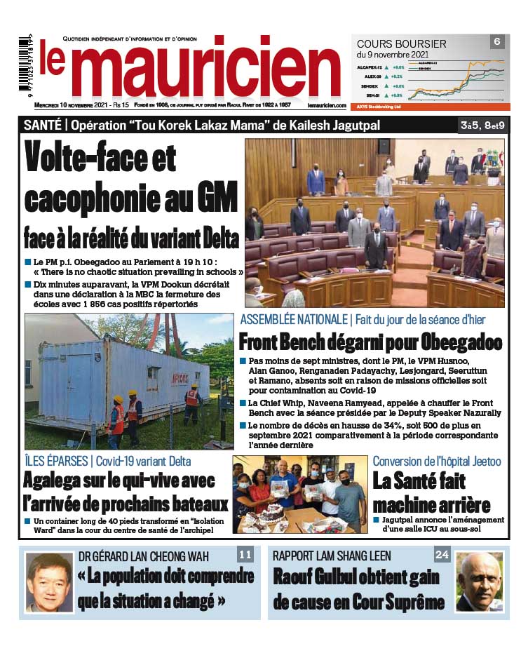 10 Nov 2021 08h30 Le Mauricien du 10 novembre 2021 Abonnement Le journal en continue #Savetheblu : l’avenir de l’océan au cœur d’une réflexion collective 16 Déc 2025 16h00 Période festive et fortes chaleurs : 930 cas de gastro-entérite recensés mi-décembre 16 Déc 2025 15h00 Trou-aux-Biches : un homme agressé lors d’un vol à son domicile, Rs 73 000 emportées 16 Déc 2025 14h13 Admission en Grade 7 : deux jours pour les demandes de transfert 16 Déc 2025 13h56 National AI Innovation Challenge : L’innovation numérique portée par les collégiens 16 Déc 2025 13h55 Mare-La-Chaux : le corps d’un jeune homme disparu retrouvé en état de décomposition 16 Déc 2025 13h53 Depuis janvier : 118 mineurs placés en shelters par la justice 16 Déc 2025 13h29 Procès de Dominique Seedeeal : le jugement reporté 16 Déc 2025 10h18 Loading... ACTUALITÉS #Savetheblu : l’avenir de l’océan au cœur d’une réflexion collective Le week-end dernier, les côtes du Nord et le village de Grand Gaube ont vibré au rythme d'une journée d'activités entièrement dédiée à la... 16 Déc 2025 16h00 Période festive et fortes chaleurs : 930 cas de gastro-entérite recensés mi-décembre 16 Déc 2025 15h00 Trou-aux-Biches : un homme agressé lors d’un vol à son domicile, Rs 73 000 emportées 16 Déc 2025 14h13 Admission en Grade 7 : deux jours pour les demandes de transfert 16 Déc 2025 13h56 #Savetheblu : l’avenir de l’océan au cœur d’une réflexion collective Le week-end dernier, les côtes du Nord et le village de Grand Gaube ont vibré au rythme d'une journée d'activités entièrement dédiée à la... 16 Déc 2025 16h00 si vous l'avez raté Saison des pluies : Ajay Gunness exige l’accélération du nettoyage des drains et des rivières 15 Déc 2025 16h43 Sam Lauthan démissionne comme président de la National Agency for Drug Control 15 Déc 2025 17h32 vidéos Réformes scolaires: l’ancienne ministre de l’éducation dénonce un système jugé élitiste et excluant 15 Déc 2025 16h07 Disque de l’année : les artistes dénoncent une participation… sans aucun paiement 11 Déc 2025 07h00 [LIVE] Assemblée Nationale : la PNQ du jour axée sur les dépenses électorales de décembre 2024 9 Déc 2025 09h09 Reconfiguration de l’avenue Père Laval : un projet de Rs 10 millions officiellement ouvert aux automobilistes 3 Déc 2025 15h26 Rapport du PRB : Navin Ramgoolam ne peut avancer de date pour la publication 2 Déc 2025 12h33