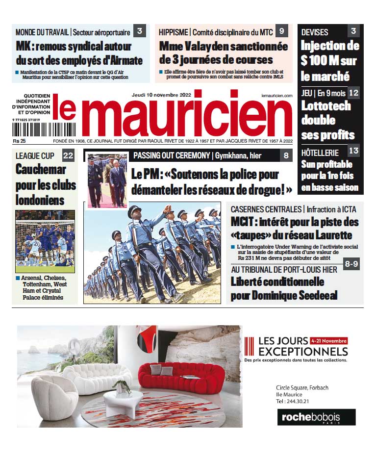 10 Nov 2022 07h50 Le Mauricien du 10 novembre 2022 Abonnement Le journal en continue Météo : la dépression tropicale Grant se rapproche de St Brandon 3 Jan 2026 18h56 Iran: Khamenei estime « justes » les revendications économiques des manifestants 3 Jan 2026 16h30 Port-Louis : une plainte pour violence domestique après la découverte d’une seringue dans les jouets des enfants 3 Jan 2026 15h52 Trump affirme que Maduro a été « capturé et évacué » du Venezuela 3 Jan 2026 14h30 Pont de Beau Champs : changements de circulation à Bel Ombre dès le 5 janvier 3 Jan 2026 14h00 Mahashivratree 2026 : Le ministère impose des normes strictes pour les Kanwars 3 Jan 2026 14h00 Explosions : le Venezuela « dénonce la très grave agression militaire » des Etats-Unis 3 Jan 2026 12h32 Rétrospective : 2025, l’année des promesses contrariées, des comptes à rendre et une FCC à la fois toute-puissante et sous pression 3 Jan 2026 12h00 Loading... ACTUALITÉS Météo : la dépression tropicale Grant se rapproche de St Brandon La dépression tropicale Grant continue de se rapprocher de St Brandon, où une dégradation progressive du temps est attendue. À 16h00 ce samedi, le... 3 Jan 2026 18h56 Iran: Khamenei estime « justes » les revendications économiques des manifestants 3 Jan 2026 16h30 Port-Louis : une plainte pour violence domestique après la découverte d’une seringue dans les jouets des enfants 3 Jan 2026 15h52 Trump affirme que Maduro a été « capturé et évacué » du Venezuela 3 Jan 2026 14h30 Météo : la dépression tropicale Grant se rapproche de St Brandon La dépression tropicale Grant continue de se rapprocher de St Brandon, où une dégradation progressive du temps est attendue. À 16h00 ce samedi, le... 3 Jan 2026 18h56 si vous l'avez raté Rétrospective : 2025, l’année des promesses contrariées, des comptes à rendre et une FCC à la fois toute-puissante et sous pression 3 Jan 2026 12h00 Suisse: après l’incendie du bar de Crans-Montana, identifier les victimes, trouver les causes 3 Jan 2026 08h43 vidéos Nouvel An 2026 : le PM Ramgoolam place l’année sous le signe de l’économie et de la consolidation démocratique 1 Jan 2026 22h13 Bilan 2025 : le ministre de la Jeunesse et des Sports fait le point sur les avancées et les défis 29 Déc 2025 19h04 Message du Président à la Nation – « Healthy Mauritius » : Vers une République de la courtoisie et du civisme 26 Déc 2025 09h02 Sécurité renforcée : 10 000 policiers mobilisés pour sécuriser l’île 22 Déc 2025 17h00 Bonus de fin d’année : comment éviter le piège du compte à sec dès la mi-janvier 21 Déc 2025 10h00