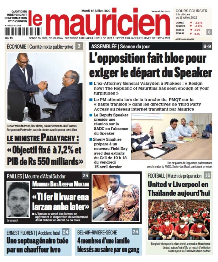 12 Juil 2022 09h26 Le mauricien du 12 juillet 2022 Abonnement Le journal en continue Météo : la dépression tropicale Grant se rapproche de St Brandon 3 Jan 2026 18h56 Iran: Khamenei estime « justes » les revendications économiques des manifestants 3 Jan 2026 16h30 Port-Louis : une plainte pour violence domestique après la découverte d’une seringue dans les jouets des enfants 3 Jan 2026 15h52 Trump affirme que Maduro a été « capturé et évacué » du Venezuela 3 Jan 2026 14h30 Pont de Beau Champs : changements de circulation à Bel Ombre dès le 5 janvier 3 Jan 2026 14h00 Mahashivratree 2026 : Le ministère impose des normes strictes pour les Kanwars 3 Jan 2026 14h00 Explosions : le Venezuela « dénonce la très grave agression militaire » des Etats-Unis 3 Jan 2026 12h32 Rétrospective : 2025, l’année des promesses contrariées, des comptes à rendre et une FCC à la fois toute-puissante et sous pression 3 Jan 2026 12h00 Loading... ACTUALITÉS Météo : la dépression tropicale Grant se rapproche de St Brandon La dépression tropicale Grant continue de se rapprocher de St Brandon, où une dégradation progressive du temps est attendue. À 16h00 ce samedi, le... 3 Jan 2026 18h56 Iran: Khamenei estime « justes » les revendications économiques des manifestants 3 Jan 2026 16h30 Port-Louis : une plainte pour violence domestique après la découverte d’une seringue dans les jouets des enfants 3 Jan 2026 15h52 Trump affirme que Maduro a été « capturé et évacué » du Venezuela 3 Jan 2026 14h30 Météo : la dépression tropicale Grant se rapproche de St Brandon La dépression tropicale Grant continue de se rapprocher de St Brandon, où une dégradation progressive du temps est attendue. À 16h00 ce samedi, le... 3 Jan 2026 18h56 si vous l'avez raté Rétrospective : 2025, l’année des promesses contrariées, des comptes à rendre et une FCC à la fois toute-puissante et sous pression 3 Jan 2026 12h00 Suisse: après l’incendie du bar de Crans-Montana, identifier les victimes, trouver les causes 3 Jan 2026 08h43 vidéos Nouvel An 2026 : le PM Ramgoolam place l’année sous le signe de l’économie et de la consolidation démocratique 1 Jan 2026 22h13 Bilan 2025 : le ministre de la Jeunesse et des Sports fait le point sur les avancées et les défis 29 Déc 2025 19h04 Message du Président à la Nation – « Healthy Mauritius » : Vers une République de la courtoisie et du civisme 26 Déc 2025 09h02 Sécurité renforcée : 10 000 policiers mobilisés pour sécuriser l’île 22 Déc 2025 17h00 Bonus de fin d’année : comment éviter le piège du compte à sec dès la mi-janvier 21 Déc 2025 10h00